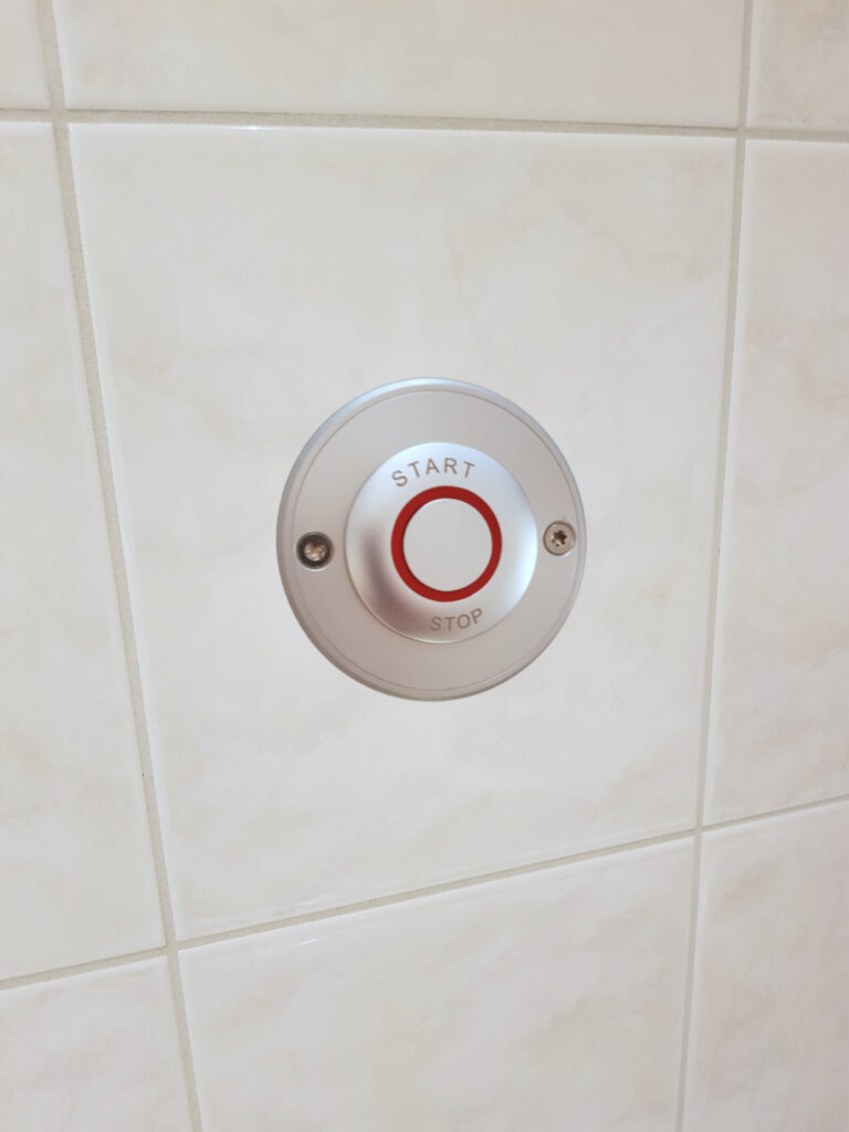 Öppnar under förinställd tid och stänger sedan automatiskt. Möjlighet finns att stoppa i förtid genom att trycka på knappen ytterligare en gång. Touchknapp minskar risken för att starta duschen av misstag vid städning.