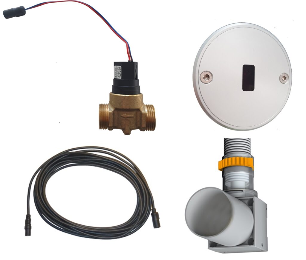 IR sensor lämplig för spolning av enskild urinal. Sensorn placeras infälld i vägg med medföljande väggdosa från LK, och har justerbar räckvidd upp till 70 cm. Magnetventil monteras i undertak vid respektive urinal, eller samlat i en grupp för hela rummet.