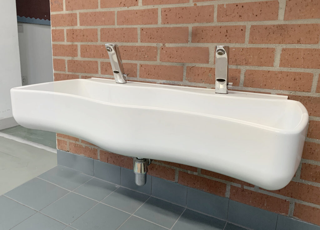 Washino 2, Tvättränna/vattenlekplats för två tvättplatser. Mjuk rundad vågform, stående utloppspip. Art. nr. 12050.502.100