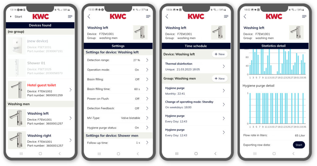 Med appen kan enheter grupperas efter placering eller funktion, vilket gör det enkelt att ändra inställningar eller utföra åtgärder som hygienspolning och städavstängning. Tidkanaler och scheman kan programmeras för automatiska funktioner, exempelvis nattlig hygienspolning eller tidsstyrd avstängning. Även hetvattenspolning kan startas manuellt eller schemaläggas i appen. Alla inställningar och statistik kan ses både för enskilda enheter och för grupper.